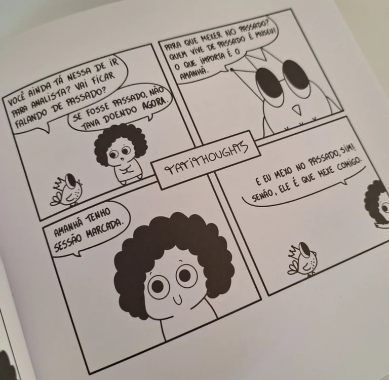 É comum ouvirmos frases como "deixa isso pra lá, já passou" ou "ficar mexendo no passado não resolve'. Mas a verdade é que aquilo que ficou mal resolvido dentro de nós continua vivendo, mesmo que tentemos ignorar. Essa tirinha do livro da psicanalista Tatiana Gomes ilustra com leveza o que acontece no processo terapêutico: olhar para o passado não é insistir na dor, mas sim compreender de onde ela vem para que se possa segui através de nosvos caminhos e com novos recursos para lidar com ela.